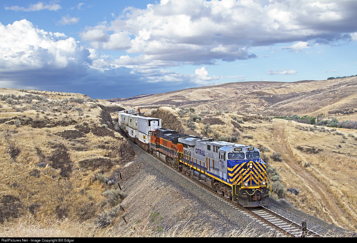 | A BNSF westbound Q train descends through Trinidad Loop on the 16 mile grade that will place the train in the Columbia River Basin, with a crew change ahead in Wenatchee, WA. The Chicago-South Seattle intermodal will be in Seattle by early Monday morning for unloading. |