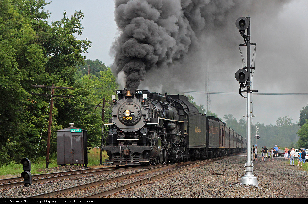 | NKP 765 puts on a good smoke show as it passes the signals at Hubbard on the NS Youngstown Line. Moments earlier, the train and crowd had encountered a pretty short but intense downpour. |