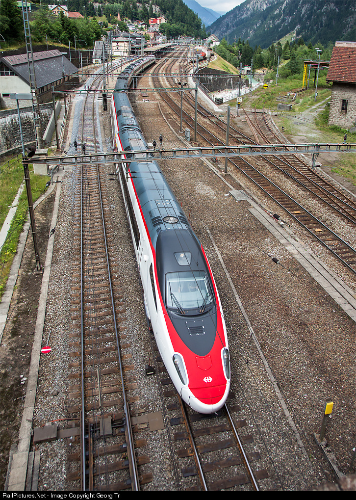 | In less then one second, the long nose of the highspeed tilting train ETR 610 will disappear in the 15 kilometer long Gotthard tunnel. Eurocity 19 is running from Zürich to Milan. |