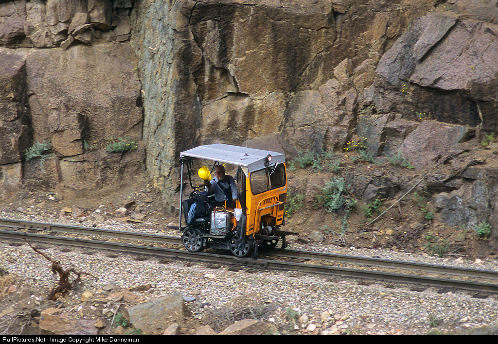 A Durango & Silverton Narrow Gauge Railroad track inspector doffs his hard hat as he cruises by mile 468.5 on the way to Rockwood, Colorado, inspecting the track ahead of the first train of the day on August 22, 2003. D&SNG uses motor cars (also sometimes referred to as pop cars and speeders) to inspect the track ahead of and behind trains operated on the line.