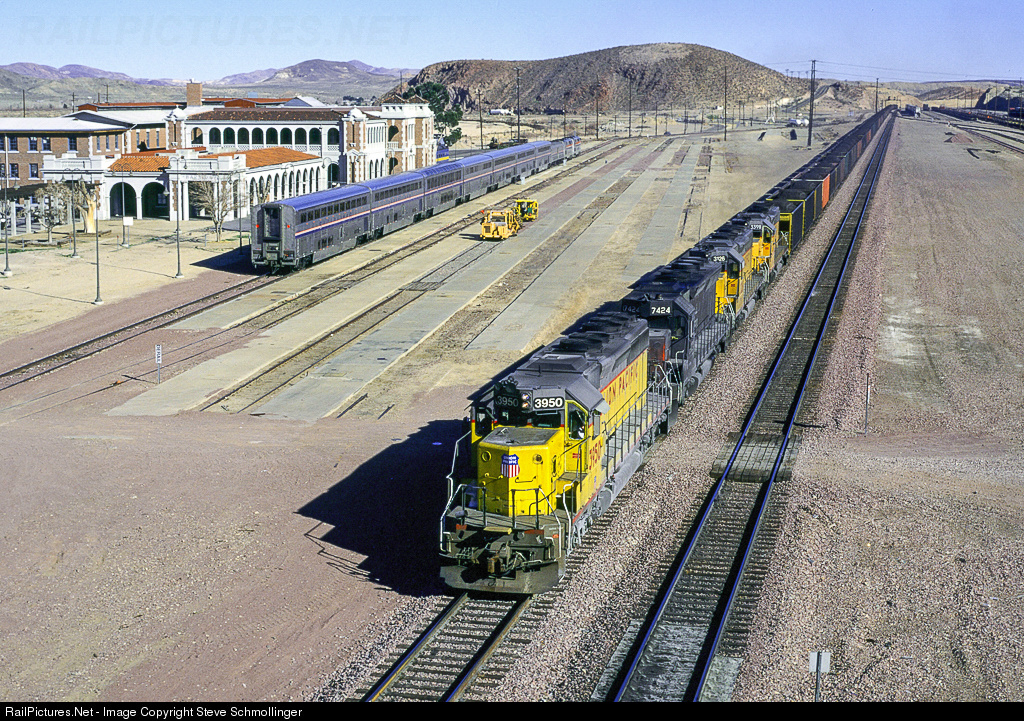 As a UP coal load heads for Cajon Pass, Amtrak No. 4 takes on passengers at the Barstow passenger depot.