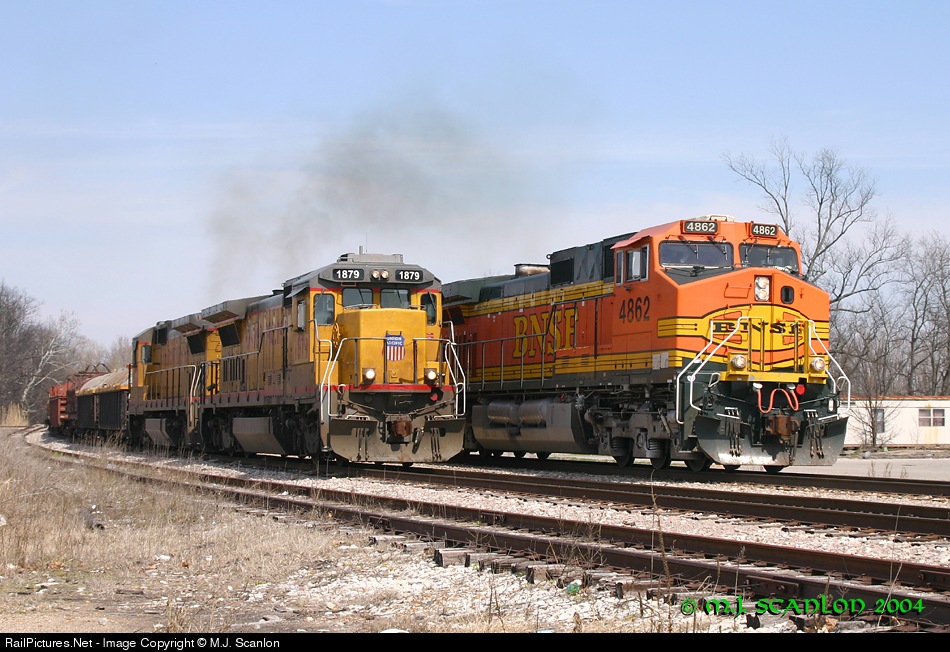 | BNSF 4862 gives way to UP 1879 on the BNSF River Sub in Turrell, Arkansas on St. Patrick's Day. UP 1879 is running on a detour with the UP MCIPB train. |