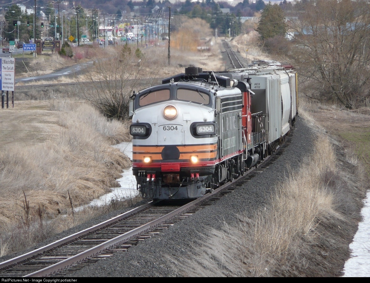 A former Canadian National locomotive, now painted in Southern Pacific's "Black Widow" scheme, begins its climb up Sunshine Hill as it departs Moscow, Idaho. The string of empties it hauls have just been retrieved from a fertilizer dealer at Wilson, outside the left frame of the photo. In the distance, the "Welcome to Idaho" sign clearly marks the border. The fertilizer dealer ceased operation in late 2014, and the tracks east of the state line have now been removed.