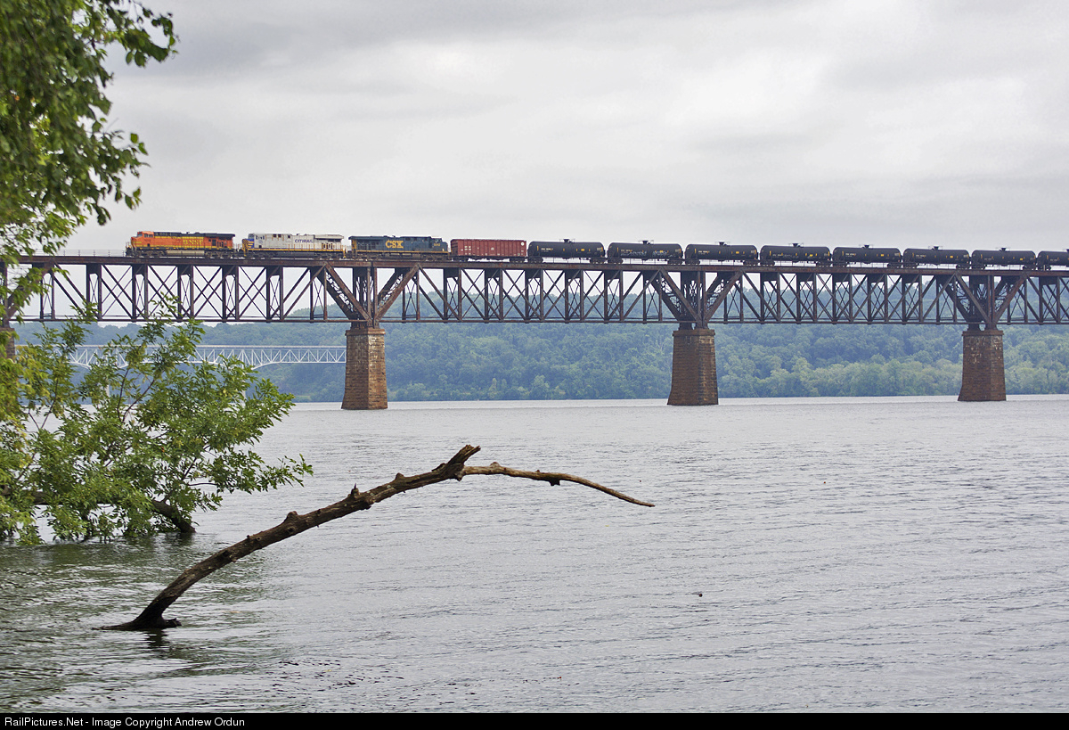| A colorful lashup leads K157-29 across the Susquehanna River, as the train approaches the western shore at Havre De Grace. |