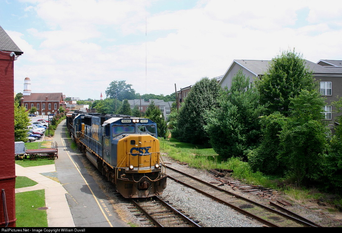 | Viewed from the Wild Wing Cafe upstairs outdoor patio, a westbound CSX train passes through the City of Charlottesville on the Buckingham Branch Railroad. CSXT 4690 is former Electro-Motive SD70M EMDX 7015 built in 1995. |