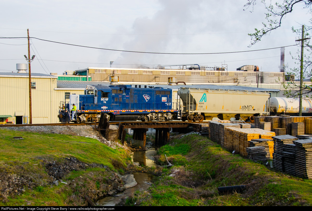 | South Carolina Central GP10 No. 75 still wears its blue and white colors (the operation is now part of Genesee & Wyoming) as it works the Sonoco plant in Hartsville, just outside Darlington. |