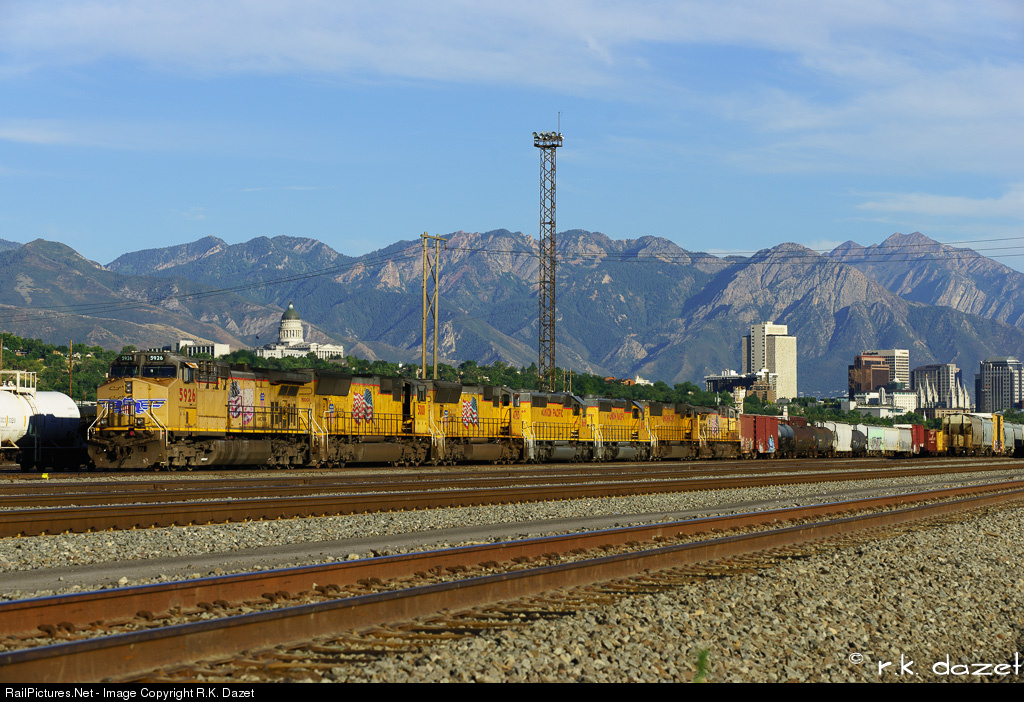 | An interesting 7 locomotive consist arrives with manifest in Salt Lake City's North Yards, on the 30th of July, 2015. |