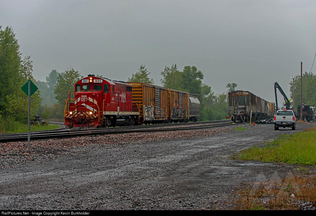 Vermont Rail System's New York & Ogdensburg crew switches the CSXT interchange in Norwood, New York with veteran Vermont Railway GP18 #801. The crew is retrieving boxcars for the paper mill in Norfolk, New York during a heavy thunderstorm on July 30.