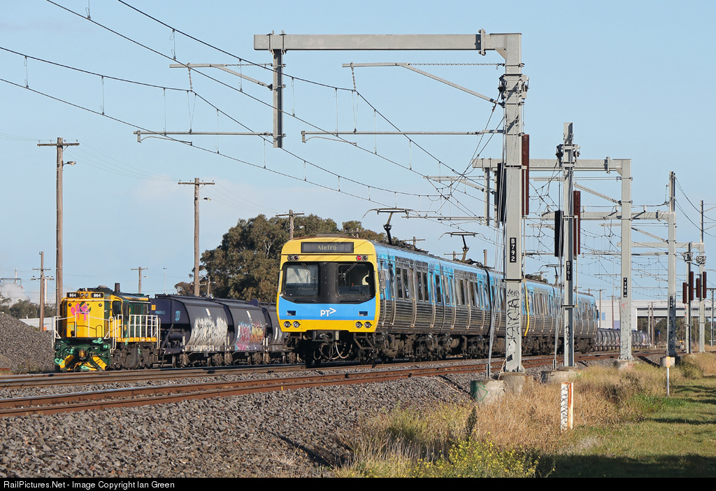 An up Metro Craigieburn service races past 864 stabled with a Qube grain consist at Somerton.