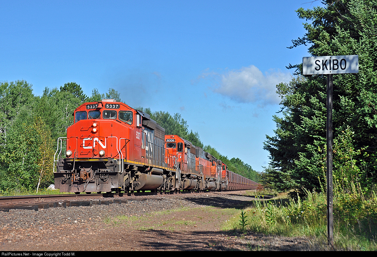 | Taconite pellets from U.S. Steel's Minntac plant are being hustled through the very small community of Skibo, MN along the CN Iron Range Sub on a great summer morning led by CN 5337 on the way to Two Harbors, MN. |