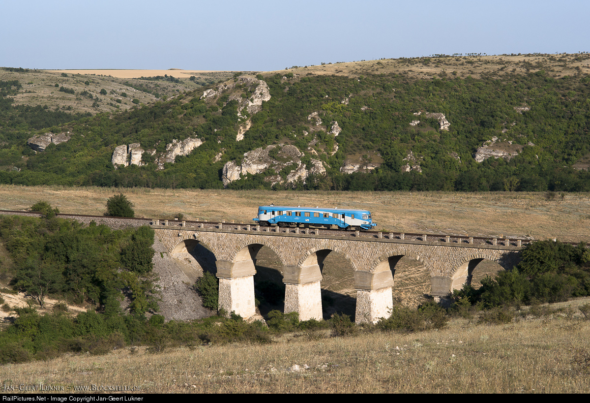 Between Medgidia and Tulcea the old Malaxa 750 DMU are still in use. R 8654 crosses a small viaduct at the rocks of Târguşor.