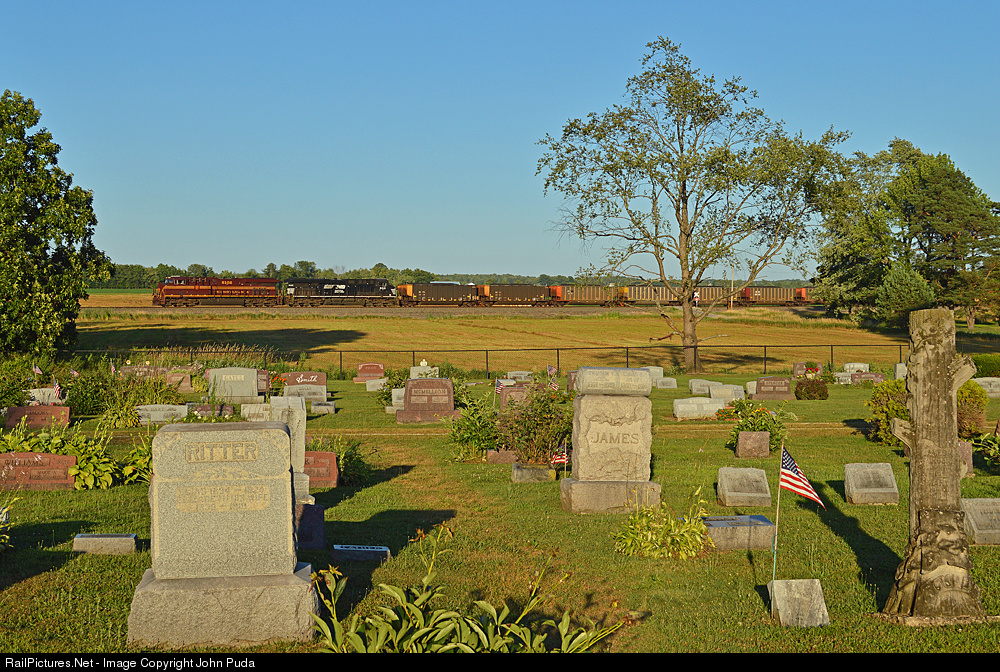 | On a beautiful summer evening, loaded coal train 552 heads north on the NS Youngstown Line as it passes through the small town of Dorset with the PRR heritage unit on the point. |