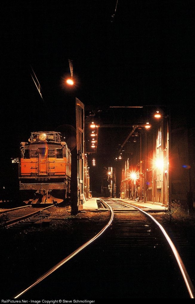 Boxcab electric E29 sits quietly outside the Avery engine shed at night.