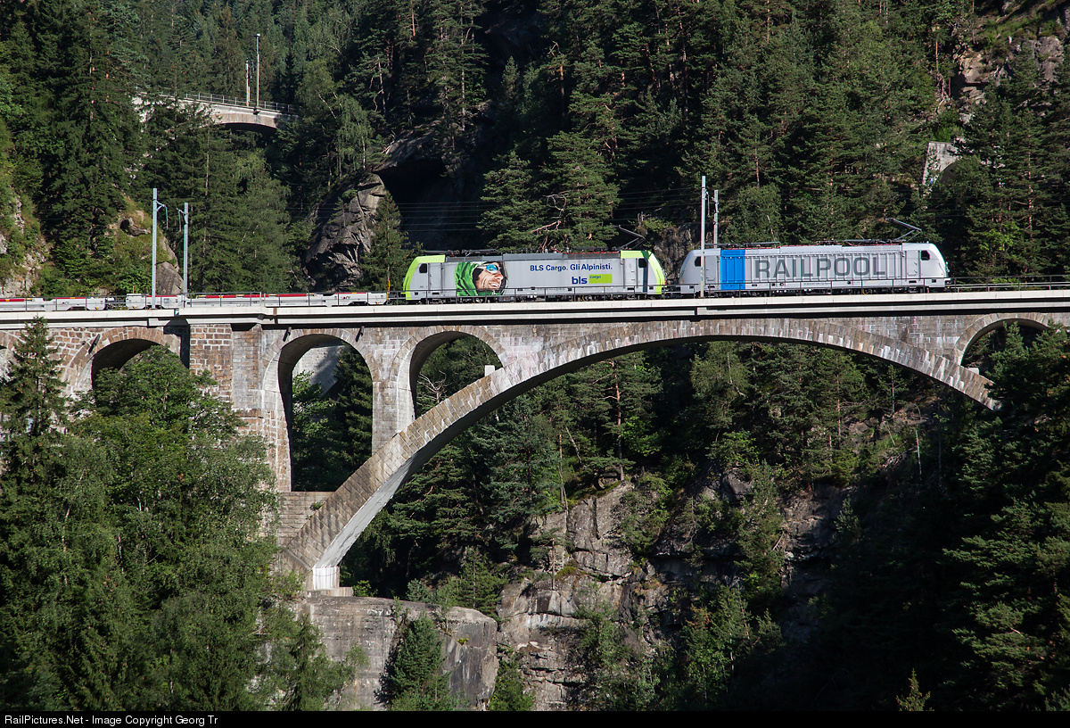 "Cargobeamer" train 40273 from Köln to Melzo is crossing the middle Meienreuss bridge, pulled by 187 006 of Railpool (rented by BLS Cargo) and Re 486 504 of BLS Cargo in multiple. In the background the upper Meienreuss bridge, which the train will cross in about 2 minutes in opposite direction, after rolled through the Leggistein loop tunnel.