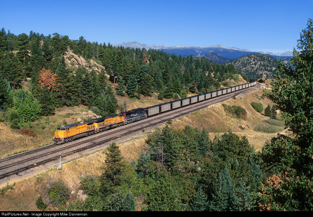 On the morning of September 4, 2000, an eastbound Union Pacific coal train drops downgrade through Crescent, Colorado. The Continental Divide of the Rocky Mountains is in the background.