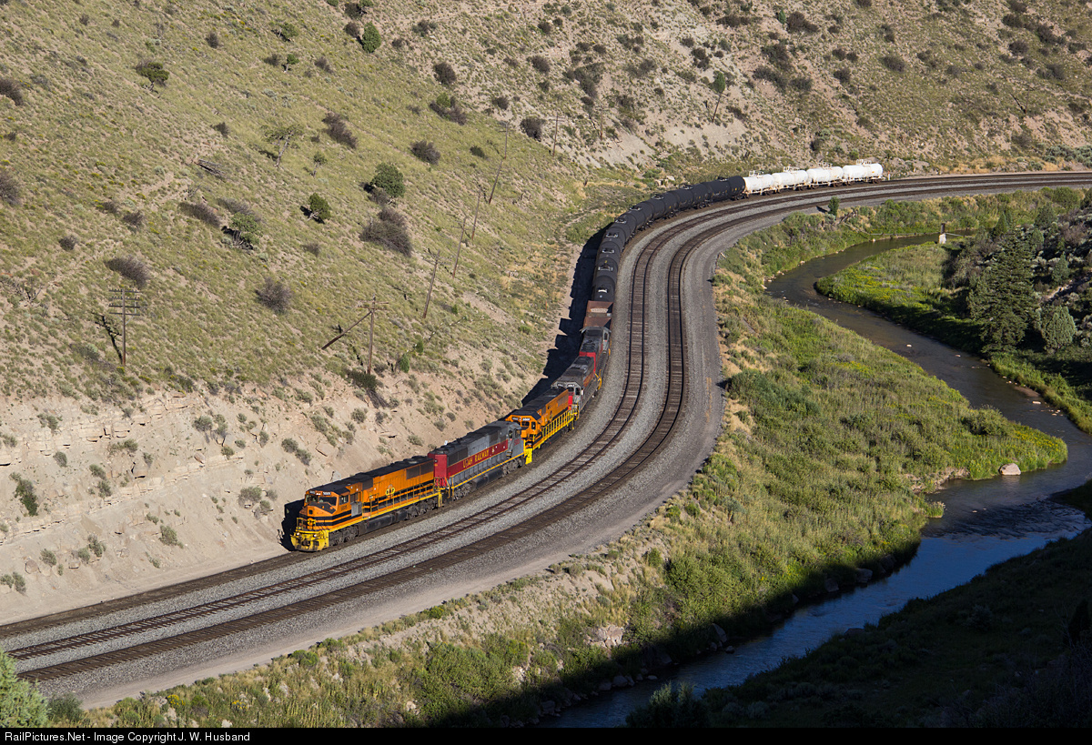 Working through the curves near Kyune on Union Pacific's Provo Subdivision, five of Utah Railway's big six axle road units have a short oil train well in hand as it heads upgrade toward Soldier Summit.