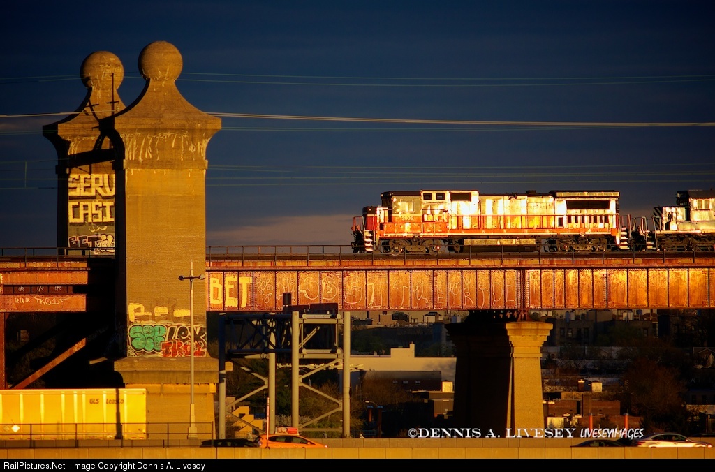| A LONG way from home, Providence & Worcester train FPCH (Fresh Pond-Ceder Hill) is just a few miles into it's trip. Slowly coming down the north leg of the Hell Gate at sunset, it will be well after dark with the crew ties up. This train is a favorite for it is one of the few freights in New York City. |