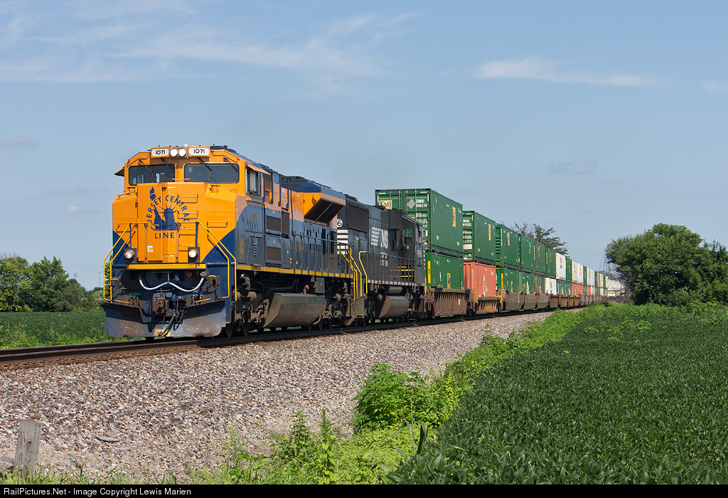 Norfolk Southern's Central Railroad of New Jersey heritage unit shines on the point of Atlanta-Kansas City, Mo., intermodal NS 224 as the train rolls out of rural Bartelso on August 7, 2015.