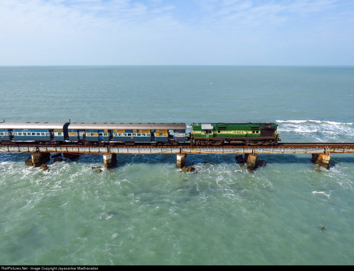 Considered as one of the most dangerous rail bridge, Pamban Bridge, a passenger train bound for Rameswaram rolls at 10 - 15 kmph with GOLDEN ROCK WDM-2 in lead.