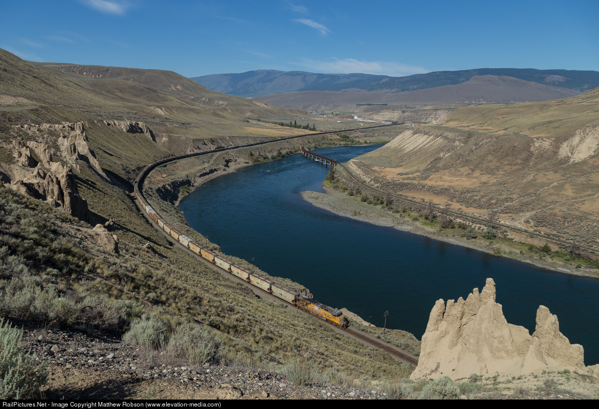 With such a variety of Union Pacific power appearing on Canadian Pacific trains, sometimes it's hard to tell if it's actually a CP train. This westbound CP potash train puts on a pretty good disguise, as the train winds alongside the Thompson River.