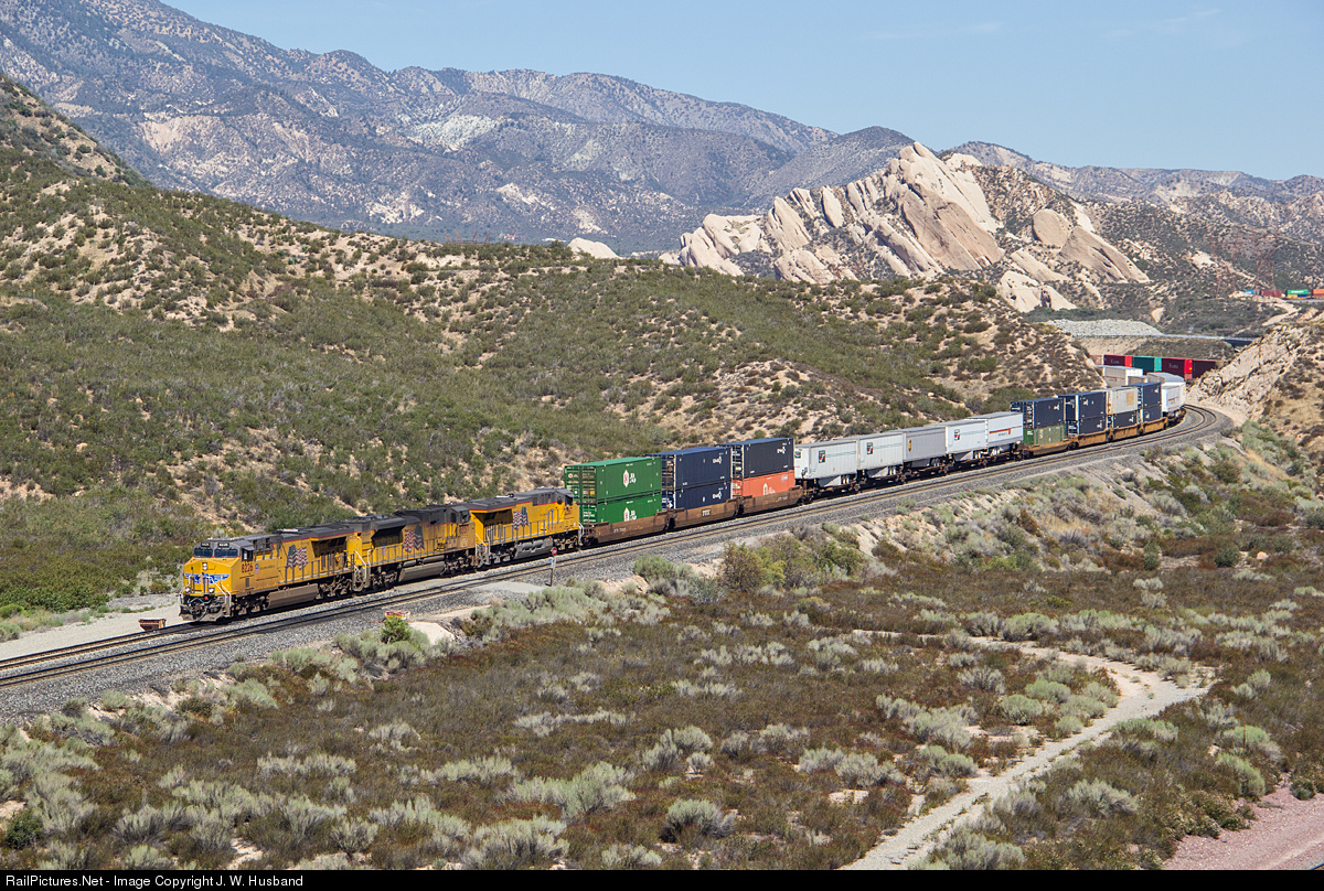 | Running a bit later than usual through Cajon Pass, the Union Pacific's priority "Brooklyn" intermodal train from Portland to Los Angeles descends the grade on the ex-SP Palmdale Cutoff as passes the siding at Canyon. |