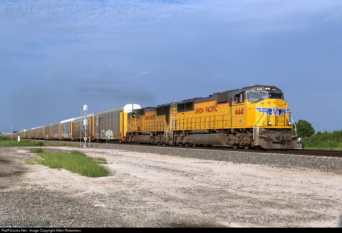| A pair of SD70Ms, UP 4441 & 4401, lead a westbound auto rack train. |