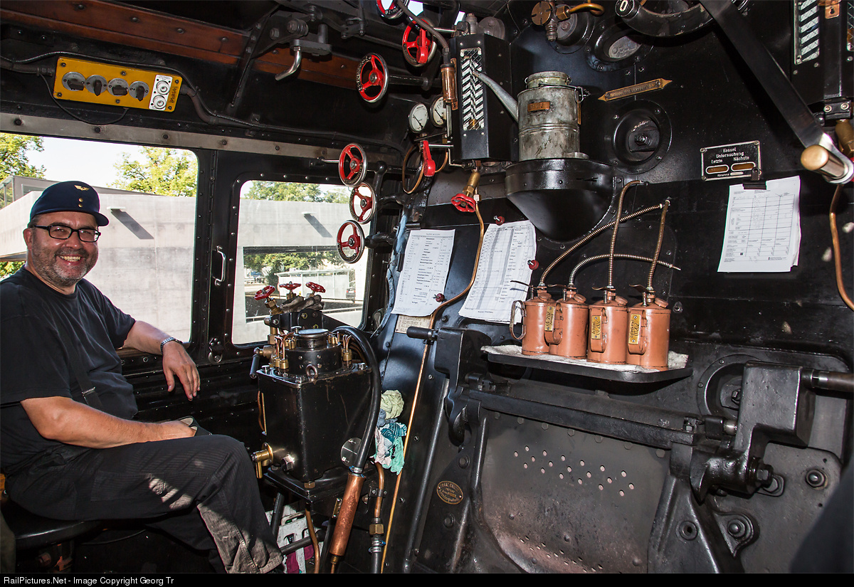 | Fireman J.H. on the "Pacific" express train steamlocomotive 01 202 during a short stop in Kreuzlingen Hafen. The train is on the way from Romanshorn via Kreuzlingen-Stein am Rhein-Schaffhausen-Waldshut-Basel Bad Bf-Basel SBB-Olten-Biel RB back to Lyss. |
