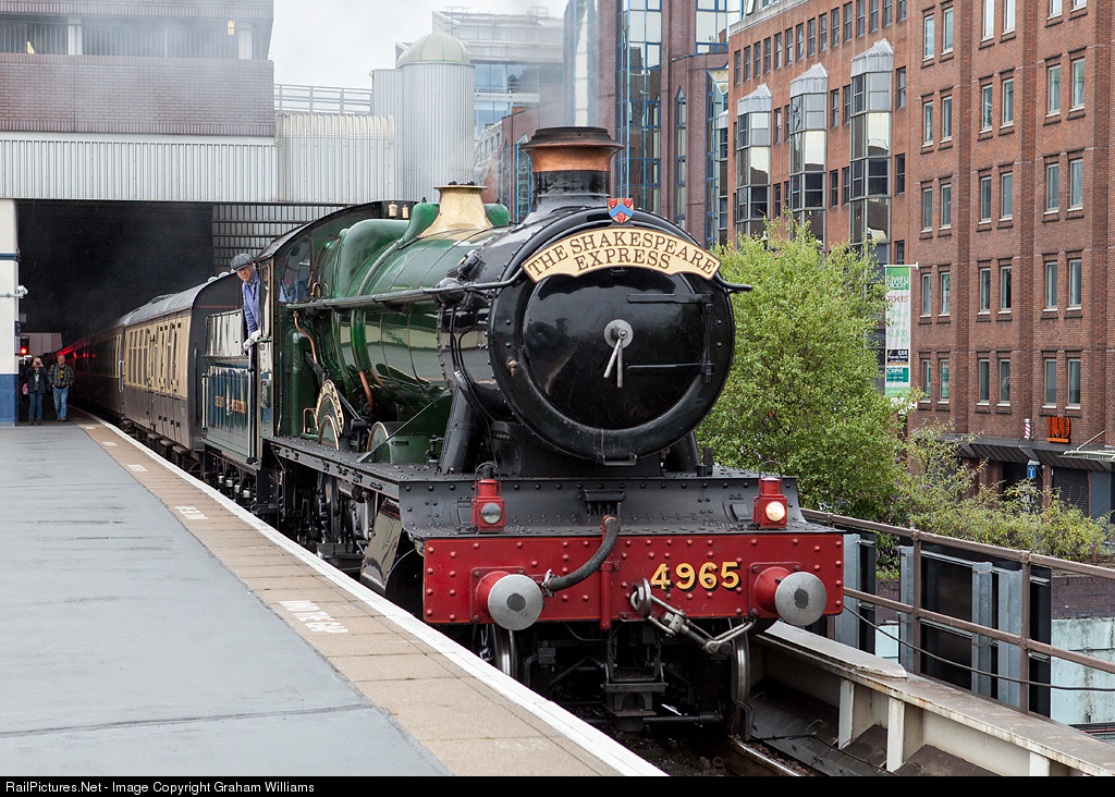 | Great Western Railway no. 4965 Rood Ashton Hall arrives at Birmingham Snow Hill Station, on a rainy Sunday morning, with the stock of the Shakespeare express |