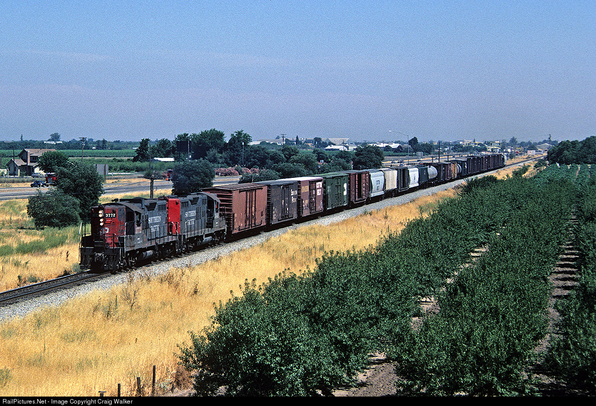 On June 27th, 1986, the Southern Pacific's westbound Tracy Roadswitcher approaches the Hammett Road overpass north of the small town of Salida, in California's Central Valley. This train worked from Tracy to Modesto and Turlock, and Espee's iconic GP9s (in this instance, 3772 and 3441) were typical power for this train. (The best time to railfan the Valley is in February, when the trees in the almond groves, such as the one in the foreground, are covered with colorful blooms!)