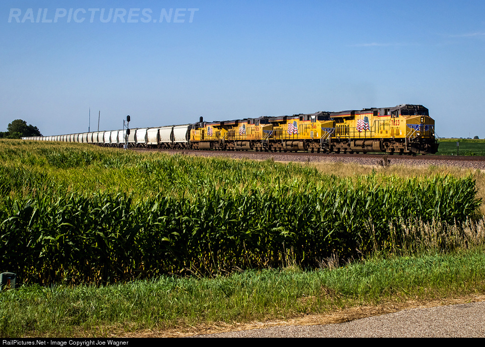 On a crystal clear morning, four matching Union Pacific AC45CCTEs bring an empty Norma, WI bound rock sand train up through Edelstein, IL, milepost 60.71 on UP's seldom-used Peoria Subdivision. Once at the town of Nelson, this train will hop onto the far busier, and double-tracked, Geneva Subdivision to scoot eastbound toward Chicago where from there it will eventually head northwest out of the city and on to Wisconsin. I say seldom-used due to the fact that on real busy days, this line will do as good as 7-9 moves in a 24-hr period with somedays seeing absolutely no traffic. Also, this field's corn crop is looking quite good as the harvest season fast approaches.