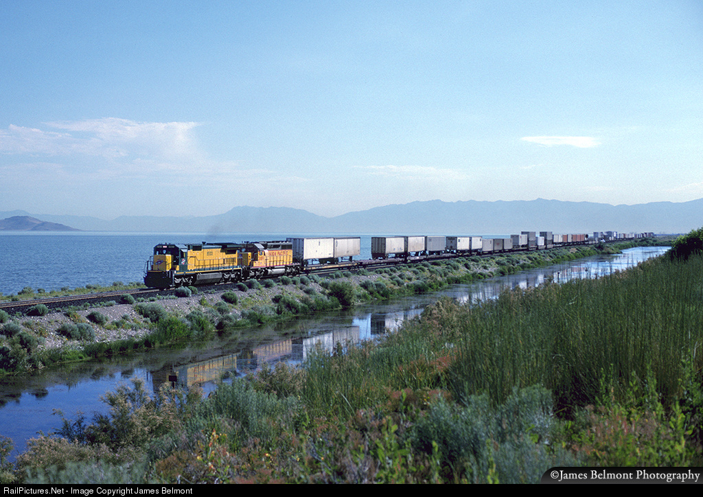 A Chicago & North Western C40-8 leads a 67 car North Platte to Oakland intermodal along the south shore of the Great Salt Lake on July 8, 1995.