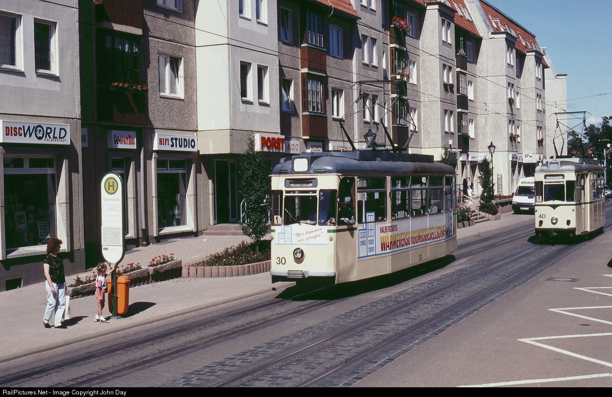The tramway in Halberstadt, a town of 40,000 people in the former East Germany, is remarkable for having survived - to this day. In 1993, fearing that most of the small eastern German town tramways would soon succumb to the rapid move to a market economy, the LRTL organized a tour to view the remaining systems. The Gotha two-axle car was built as late as 1966 and no longer runs although internet information indicates that No. 30 remains on the property as a childrens' car.