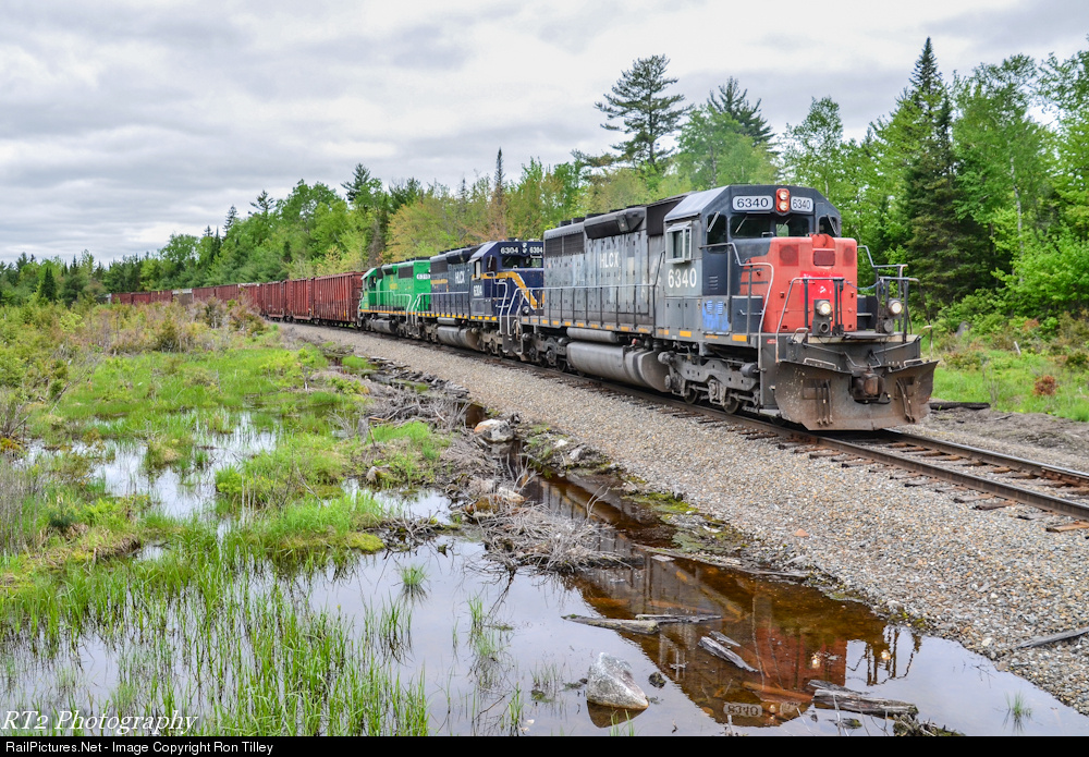 A former Southern Pacific SD40R now owned by Helm Financial leads the northbound Maine Northern Chip Train through Cedar Lake Maine.