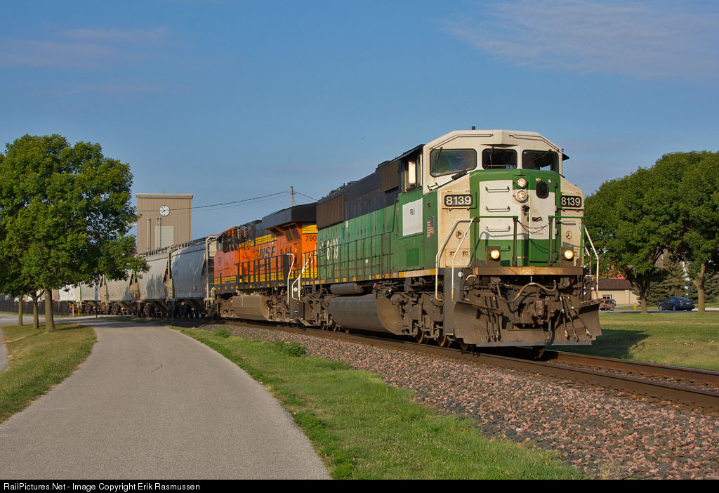 | PRLX 8139, on lease to the BNSF, runs through leading a BNSF GE on a CP sand train through Davenport. |