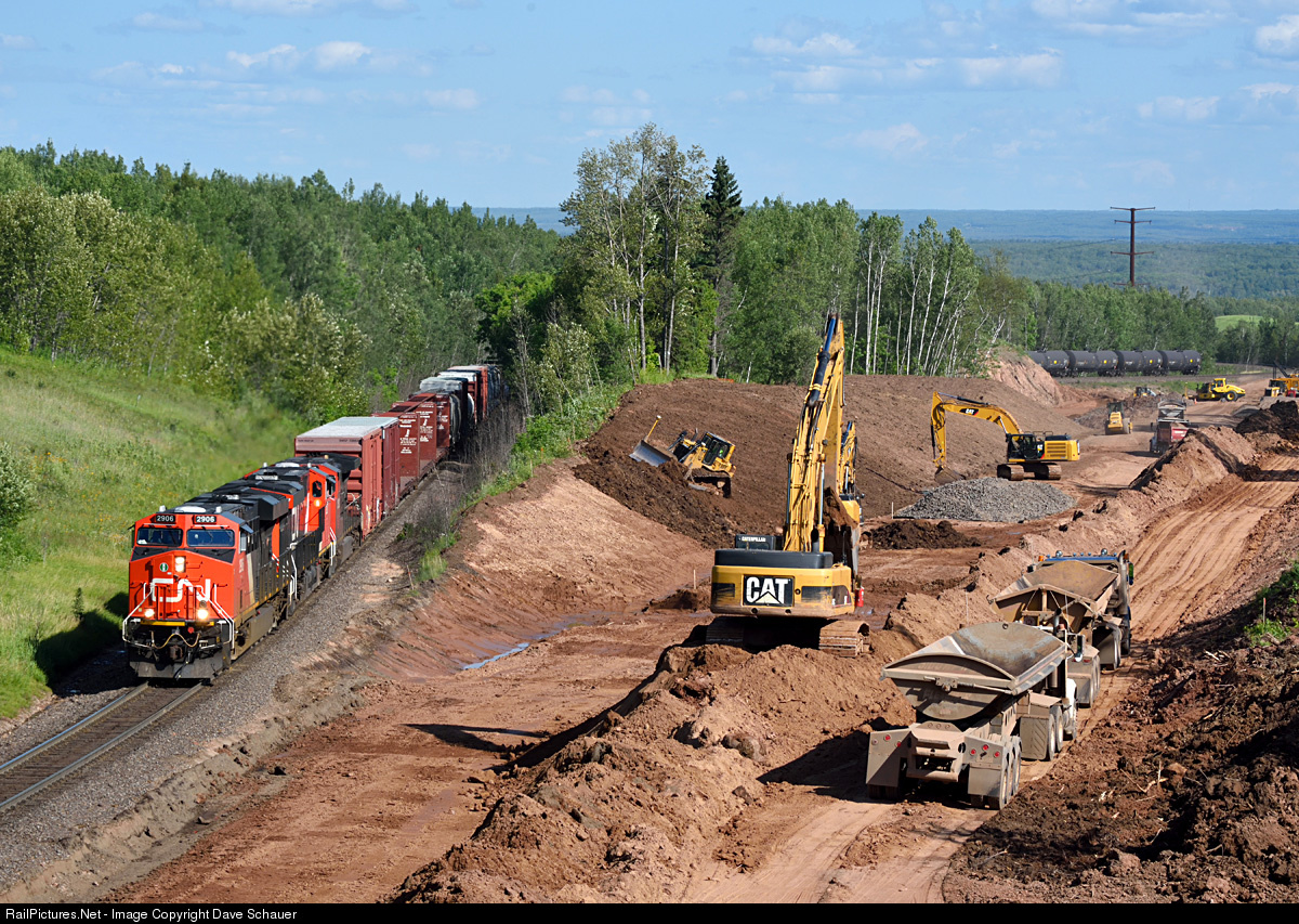 | Grading and realignment work for CN's double track project on Steelton Hill in far western Duluth is going full speed this summer. Here a short northbound transfer passes by heavy earth moving equipment. |