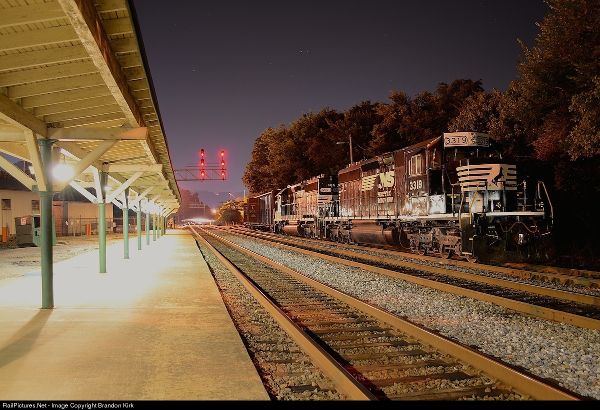 | The Anniston Amtrak Station has some company for the night, two EMD SD40-2 units NS No. 3319 and NS No. 3499 sit silent under the night sky by the stations side platform. When duty calls, these two thoroughbreds will release their horsepower and tow tons of freight throughout the Norfolk Southern system. |