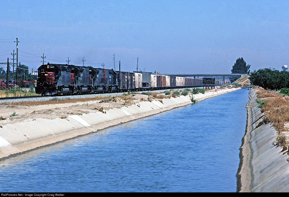 | Southern Pacific SD45R 7477 (ex-SP SD45 8982) leads three Tunnel Motors as it leads a westbound fruit block out of Ripon, in California's verdant Central Valley. The date is June 27th, 1986, and through this part of the Valley the SP's San Joaquin Subdivision parallels both Highway 99 and an irrigation canal. And Modesto's Tropical Motel is advertising rooms for just $27.00 per night! |