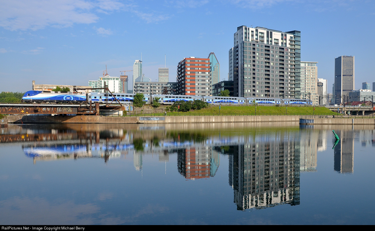 AMT 809 with Bombardier ALP-45DP AMT 1350 pushing five Bombardier multilevel cars is reflected in the Peel Basin in Montreal on a very hot morning.