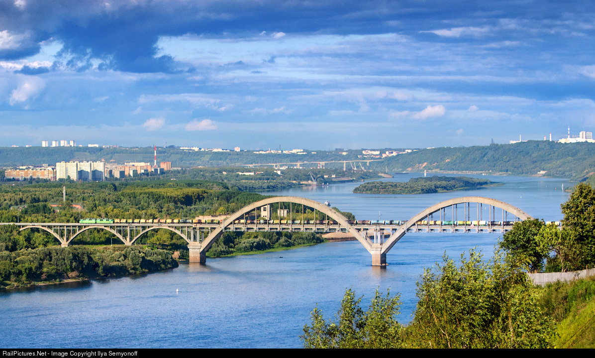 VL80 electric AC locomotive with oil train crosses Oka river, the largest right tributary of the Volga river. Not far from that bridge in Nizhny Novgorod city Oka river flows into the Volga. The width of the river at this location is about 0,5 miles.