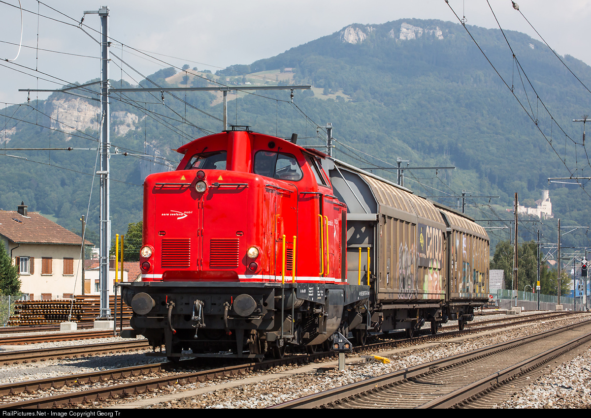 Diesel locomotive Em 327 (former Sersa Am 847 957-8 "Lotti", ex DB 211 215-9 bzw. V 100 1215, built by Henschel in 1962) of Aare Seeland mobil (asm) in Niederbipp, in the background Neu Bechburg castle above Oensingen. The asm has a 1 meter gauge network, but some dual gauge tracks (1000 mm/1435 mm) from Niederbipp to serve freight costumers with this standard gauge locomotive.