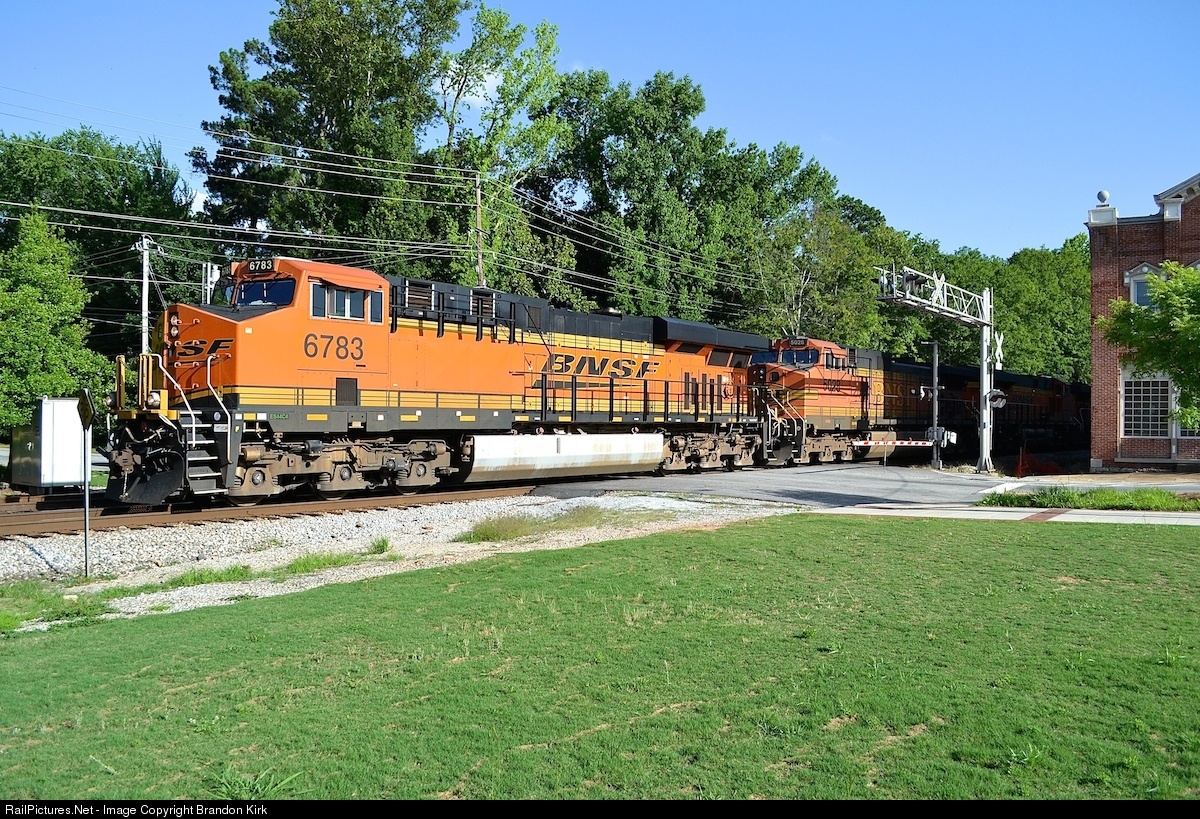 | BNSF No. 6783 rolls into the sunlight as it clears the old buildings of downtown Newnan. Loaded with stacks of intermodal containers bound for BNSF Atlanta (Fairburn) Intermodal Facility. |