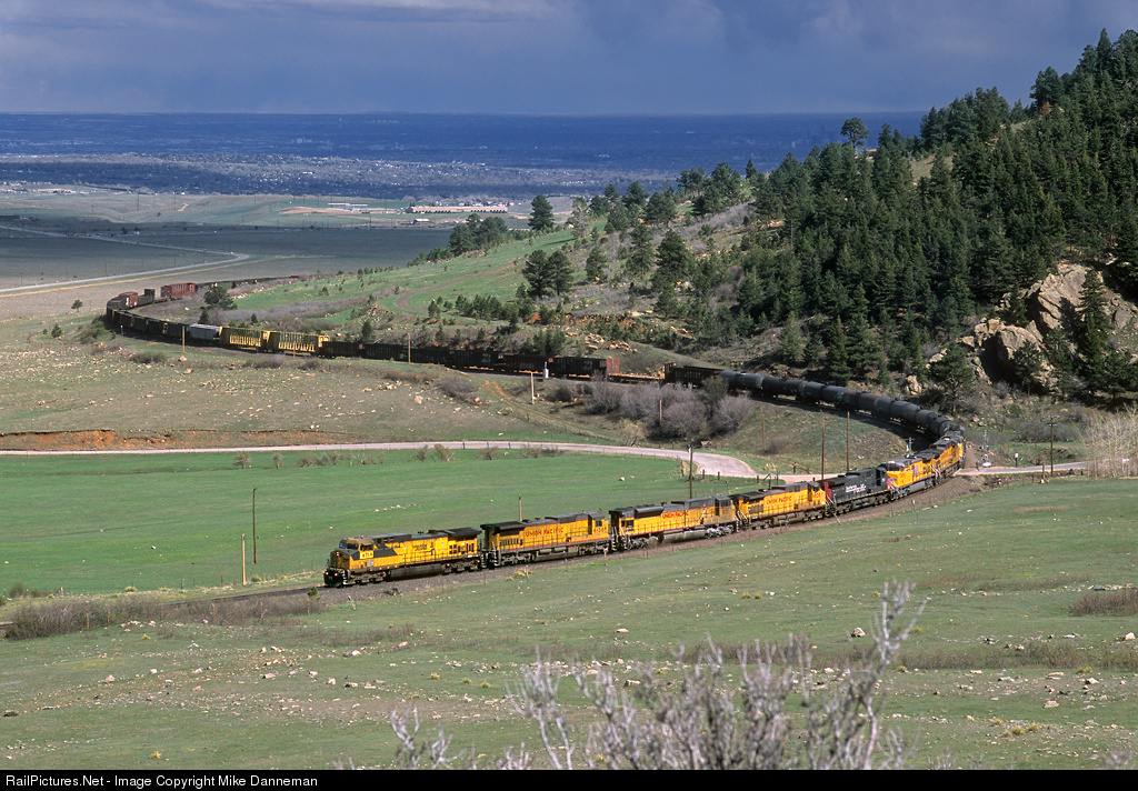 With stormy weather over the plains and the city of Denver (visible just above the tree line on the ridge) in the background, a westbound Union Pacific manifest freight climbs out of Clay, Colorado, on April 18, 2003. Leading the eight locomotive consist is a former Chicago and North Western GE AC4400CW.