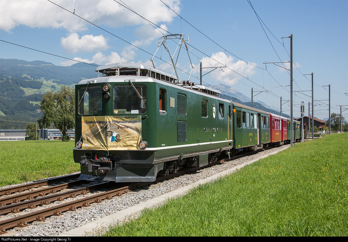 | "Muni" HGe 4/4 I # 1992 "Giswil" of zb Historic with the "Zentralschweizer Whiskyzügli" (poster on front) from Lucerne to Meiringen. The cars are AB 473, WR 426, B 865 of SBB Historic and F3 51 of the Ballenberg Dampfbahn (BDB). The 2180 HP locomotive was built by SLM, BBC and MFO in 1953 for the 1 meter gauge Brünig line (Interlaken Ost-Meiringen-Lucerne) of the SBB. |