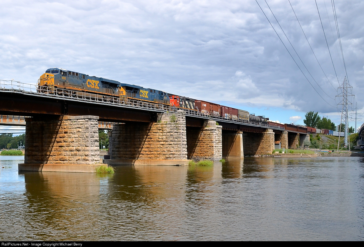 | Two CSXT GEVO's and a CN GP9. CN 327 has a pair of CSXT GEVO's (ES44AC CSXT 806 with steerable trucks and ES40DC CSXT 5272 with conventional hi-adhesion trucks) and a CN GP9 (CN 4102, which will be set off at Coteau) as it crosses over the Ottawa River during a brief period of sunshine. |