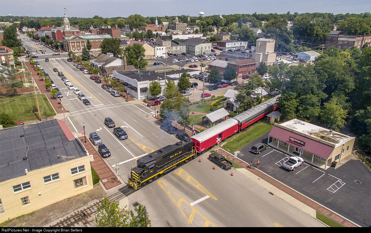 NKP 901 eases her train back to Lebanon Station in downtown Lebanon, Ohio. This GP30 has been restored to Nickel Plate colors and now earns her keep on the Cincinnati Railway. This weekend 901 is pulling excursions on the Lebanon, Mason, and Monroe Railroad's Day Out with Thomas. For more information about this or other trips, visit their website: www.lebanonrr.com/