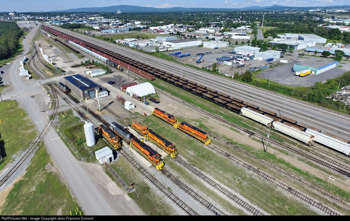 Aerial shot of the QGRY Henri-IV Yard. In front, we could see 8 QGRY locomotives, about 150 brand new ore cars destined for Sept-Iles, but never delivered due to mines closures and the "Massif de Charlevoix" tourist train in storage this year