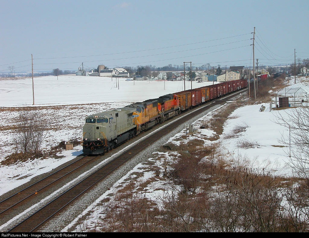 A new NS unit in primer leads a colorful consist with a UP and BNSF trailing.