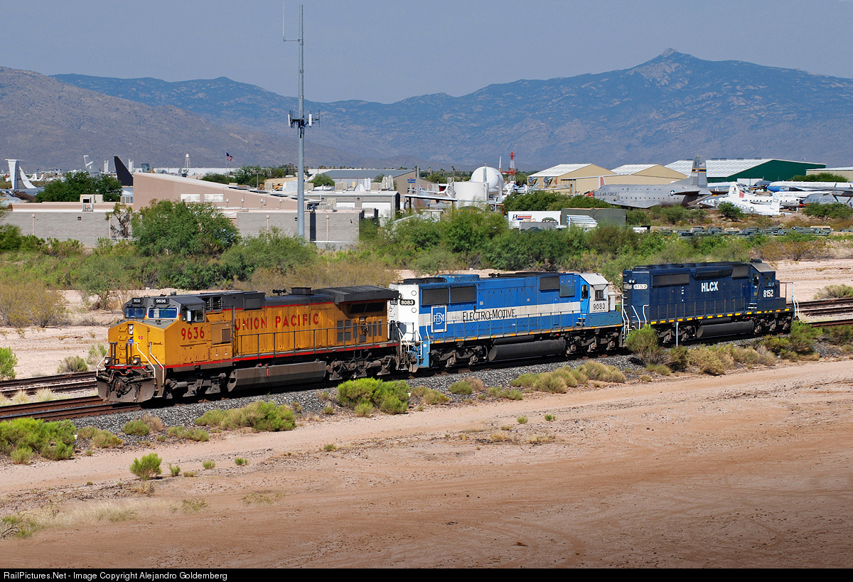 UP #9636, demonstrator #9083 and HLCX #8152 are slowly approaching to Tuscon yard. What you see behind is the display at Pima Air Space Museum . A B-52D tail, Super Guppy and C-124 can be recognized between the other planes.