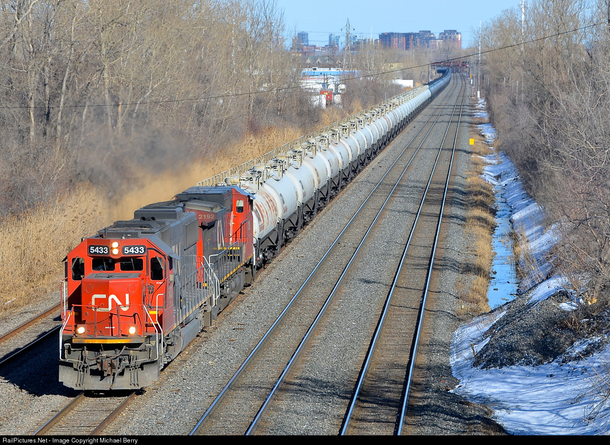 | That's a lot of tank cars. CN 705 has two of CN's secondhand units (CN 5433 & CN 2192) as well as some loaded TankTrain cars (destined for Maitland, ON) ahead of the oil empties. Here it heads west through Lachine. |