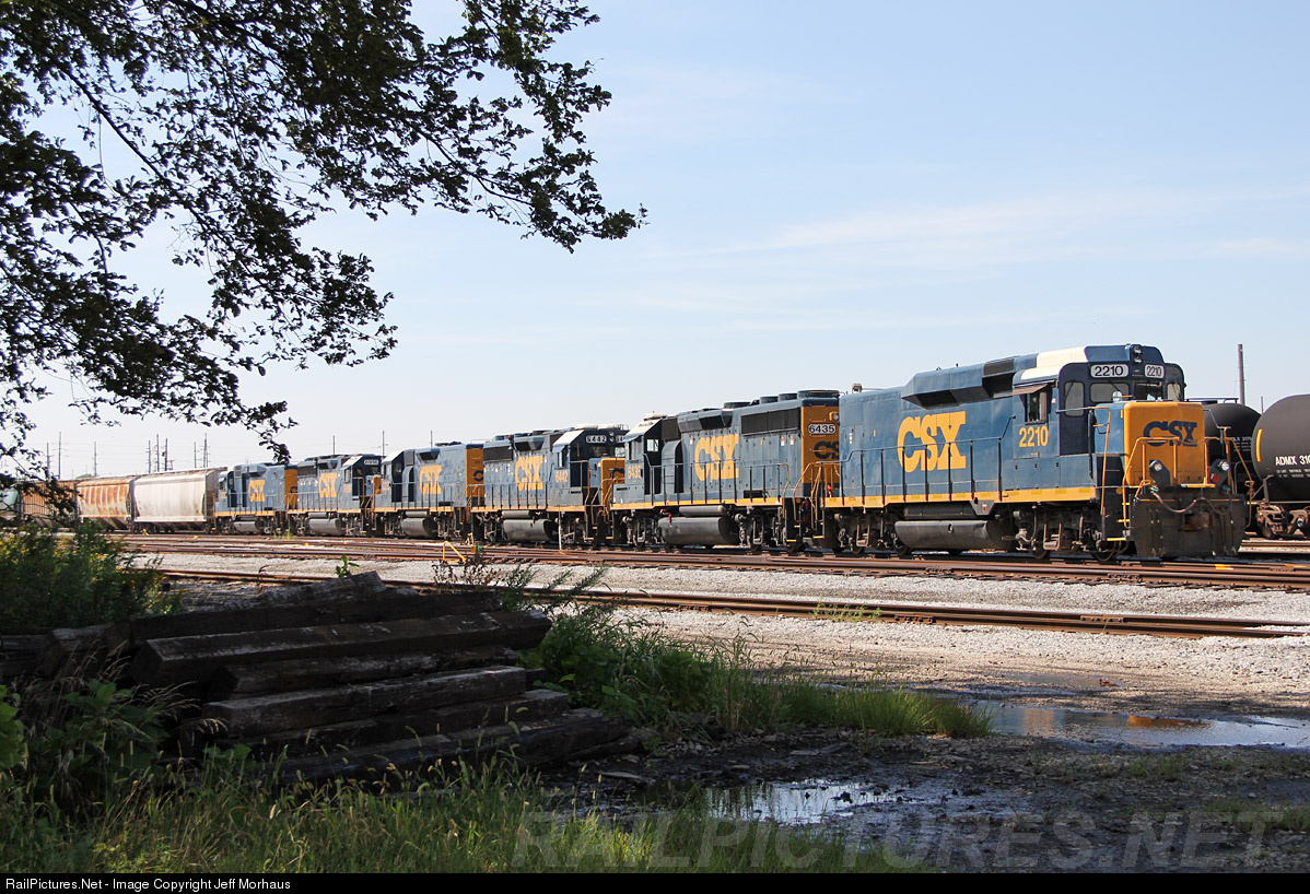 A CSX GP30 style road slug sits on the point of a short local in CSX's small yard in Decatur, Illinois. Locomotives: CSX 2210 (GP30 Road Slug), CSX 6435 (GP40-2), CSX 6442 (GP40-2), CSX 2275 (GP35 Road Slug), CSX 6916 (GP40-2) and CSX 2322 (GP30 Road Slug).